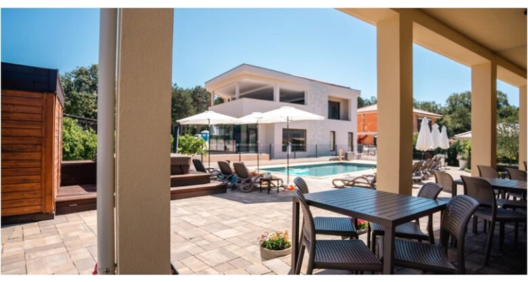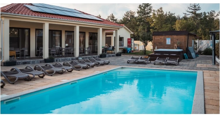 Gosti mogu uživati u vanjskom grijanom bazenu, jacuzziju i sauni, a sve to u opuštenom, zelenom okruženju malog mjesta Klimno na otoku Krku